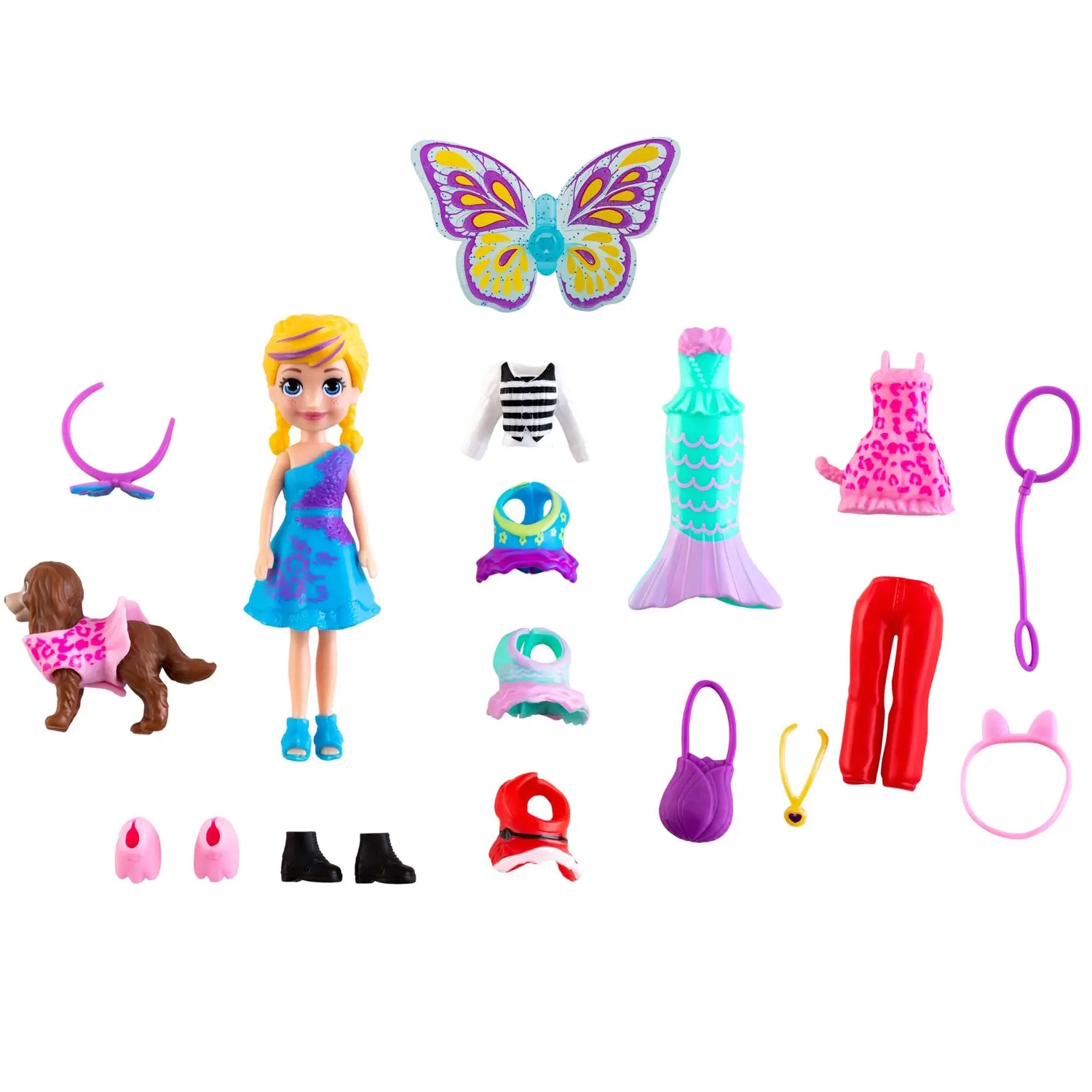 Há quatro formas de fantasiar a boneca Polly e seu bichinho de estimação agora mesmo! Com o Kit Cachorro Fantasias Combinadas, as crianças podem fantasiar a boneca Polly™ de 7 cm e o bichinho de estimação da Polly como quiserem com quatro fantasias e tiaras diferentes! Você será uma borboleta, uma sereia, uma pirata ou uma gatinha? Ou, para mais diversão, misture e combine as peças para inventar novos visuais divertidos! Cada fantasia para a boneca Polly™ e seu cãozinho de estimação inclui fantasia e tiara para diversão com o Masque 'N Match! Inclui boneca Polly™ de 7 cm, 4 fantasias completas, bichinho de estimação, 4 fantasias com temática de bichinho de estimação, 1 asa de borboleta e 1 bolsa. Cores e detalhes podem variar.